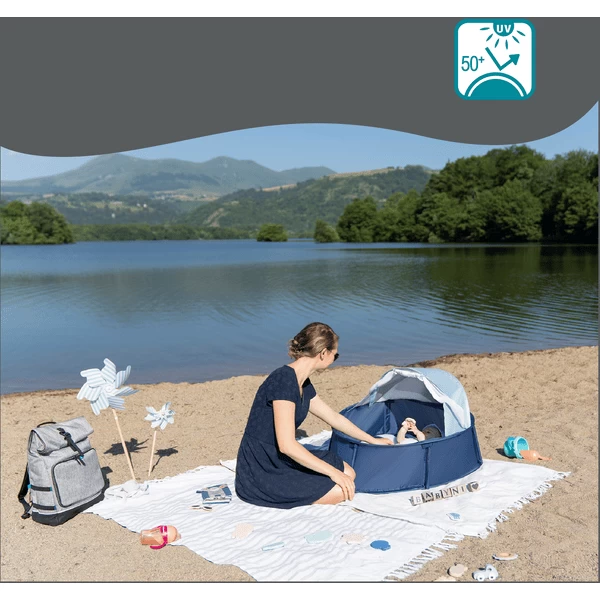 - De 2-in-1 metgezel: strandschelp en reisbedje.
