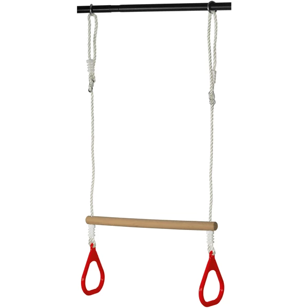 Het is een ideaal turntoestel, dat buiten naast de schommel een plaatsje vindt. Het bevat ook twee plastic ringen die op een andere manier voor een uitdaging zorgen. De lengte van de touwen kan in de hoogte worden gevarieerd.