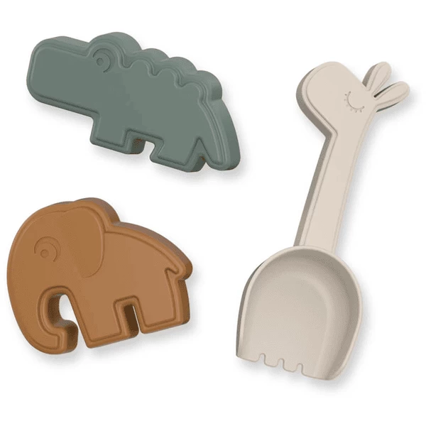 - De schattige Sand speelset voor peuters bestaat uit een krokodilvorm, een olifantvorm en een giraffeschep in drie zachte kleuren