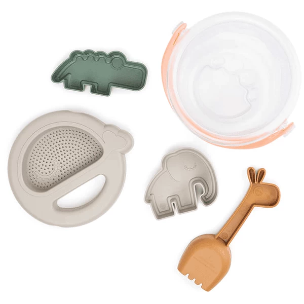 - De schattige Sand speelset voor peuters bestaat uit een krokodilvorm, een olifantvorm, een giraffeschep, een walviszeef en een doorzichtige emmer