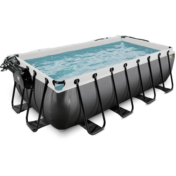 Het EXIT Black Leather zwembad heeft een luxueuze uitstraling dankzij het unieke leer print . Met de zwarte buitenkant en de lichtgrijze binnenkant heeft u een modern zwembad in uw tuin. Het EXIT zwembad heeft sterke 3-laagse wanden van PVC en polyester. De hoogwaardige Sand filterpomp reinigt de kleinste deeltjes uit het zwembad door het water door een filterbed te pompen. Dit zorgt ervoor dat vuil zoals Sand , insecten of algen in het filter terechtkomen.