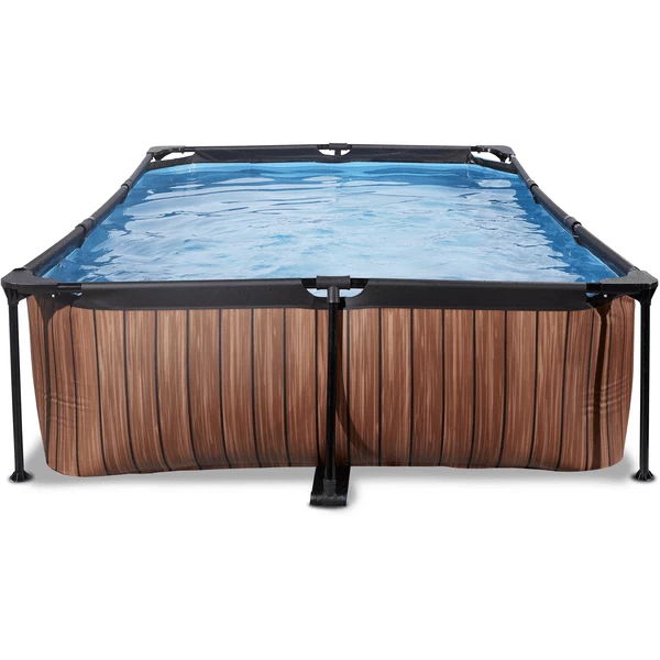Het compacte zwembad is standaard uitgerust met een filterpomp en onderscheidt zich onder andere door het grote houten patroon.