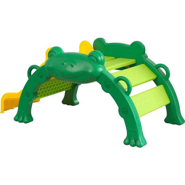 De kleintjes zullen op en neer springen van plezier als ze over de gebogen klimmuur op de rug van de kikker klimmen en dan naar beneden glijden. De leuningen aan beide zijden helpen bij een zelfverzekerde en zelfstandige klim. En op handen en voeten, op naar een koele schuilplaats onder de lachende kikker zijn frame. De Bouncing Frog Klimglijbaan zorgt voor veel plezier in de tuin.
