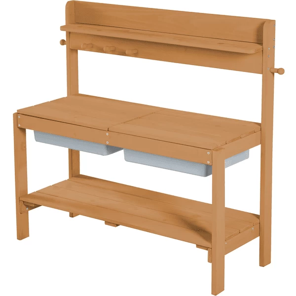 In de winter kan de overdekte tuinkeuken worden omgebouwd tot een ideale knutseltafel met een opbergbak voor stiften, boetseerklei en knutselbenodigdheden. De veelzijdige kinderkeuken kan worden gebruikt als werktafel of speeltafel en, dankzij de twee afneembare hoezen, ook als moddertafel. De twee uitneembare kuipen van robuuste kunststof die onder de afdekplaten zijn geïntegreerd, zijn ideaal als speelruimte en zijn gemakkelijk schoon te maken.